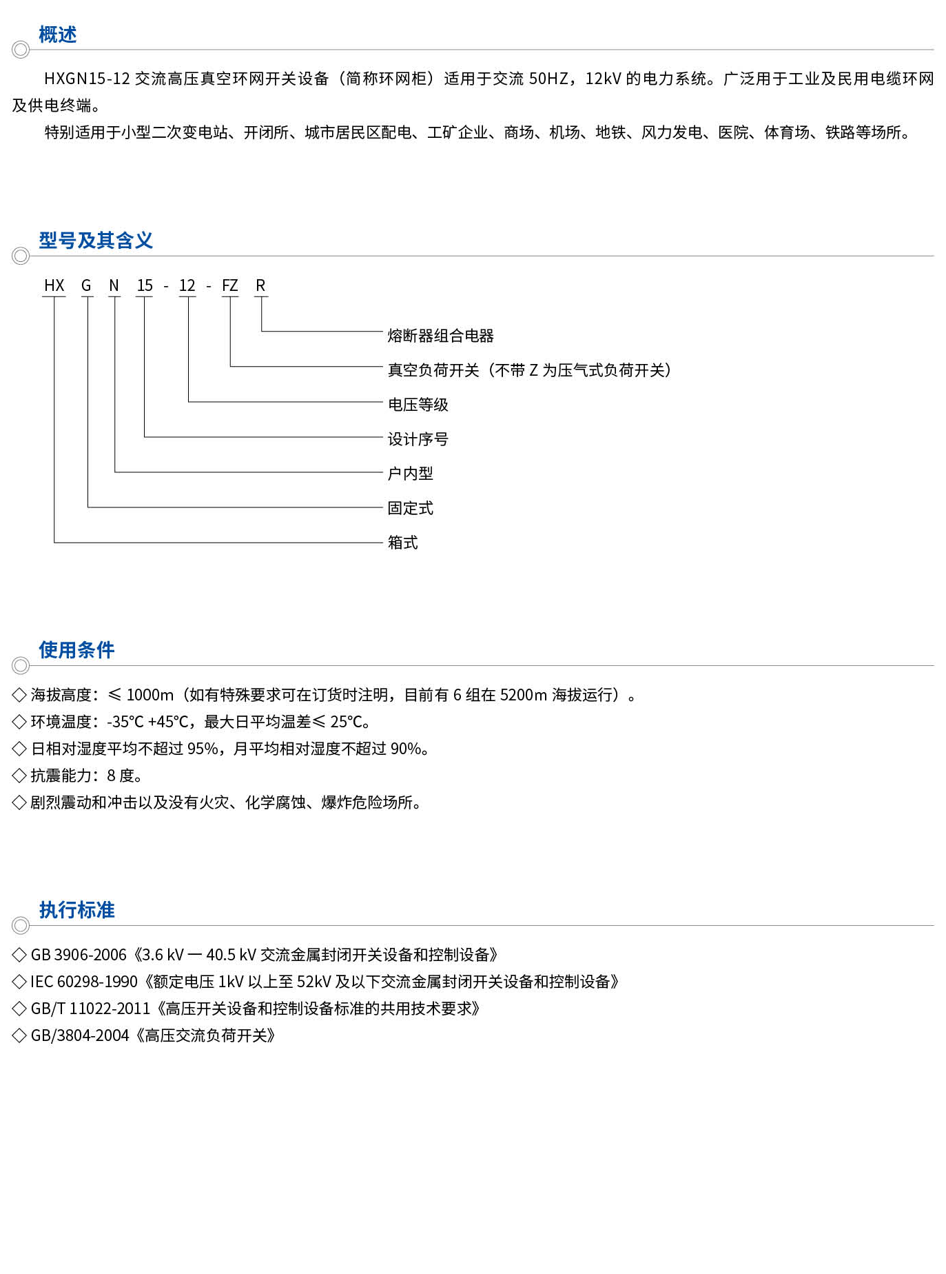 HXGN15-12交流高压真空环网开关设备(简称环网柜)适用于交流50HZ,12kV的电力系统。广泛用于工业及民用电缆环网及供电终端。特别适用于小型二次变电站、开闭所、城市居民区配电、工矿企业、商场、机场、地铁、风力发电、医院、体育场、铁路等场所。